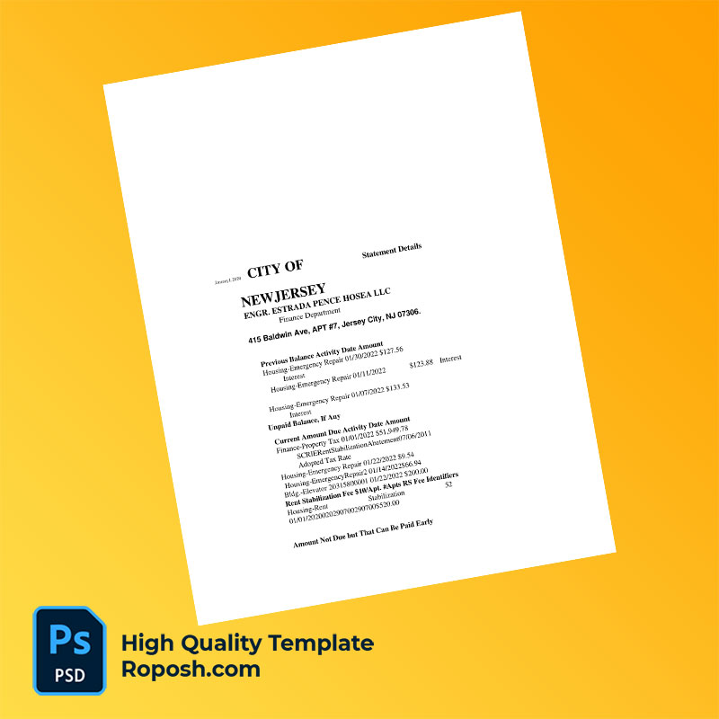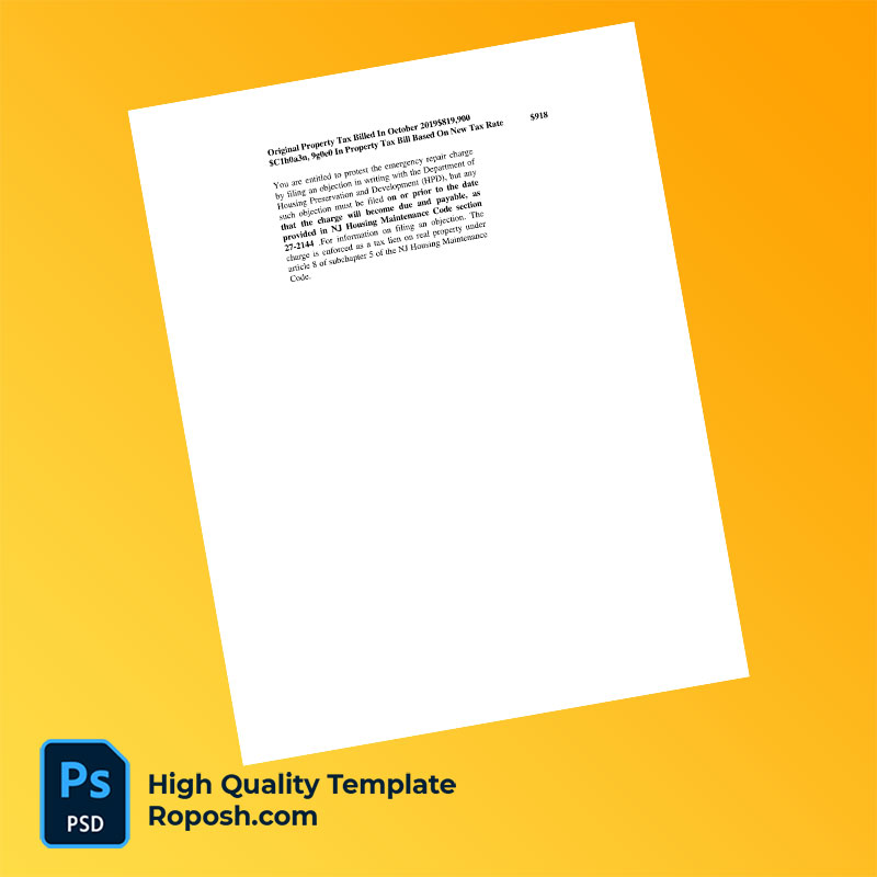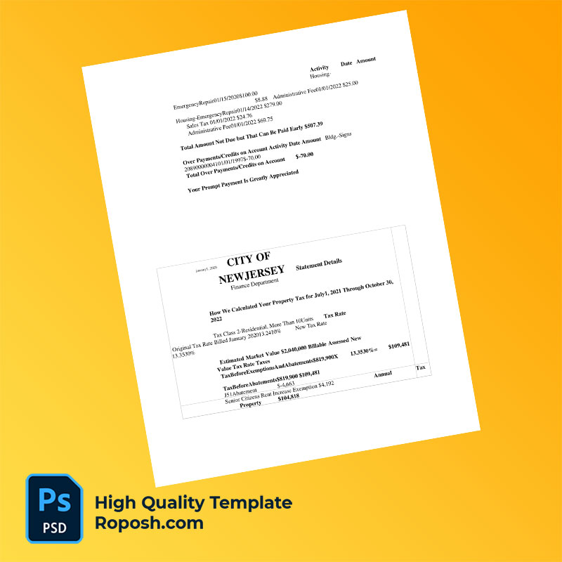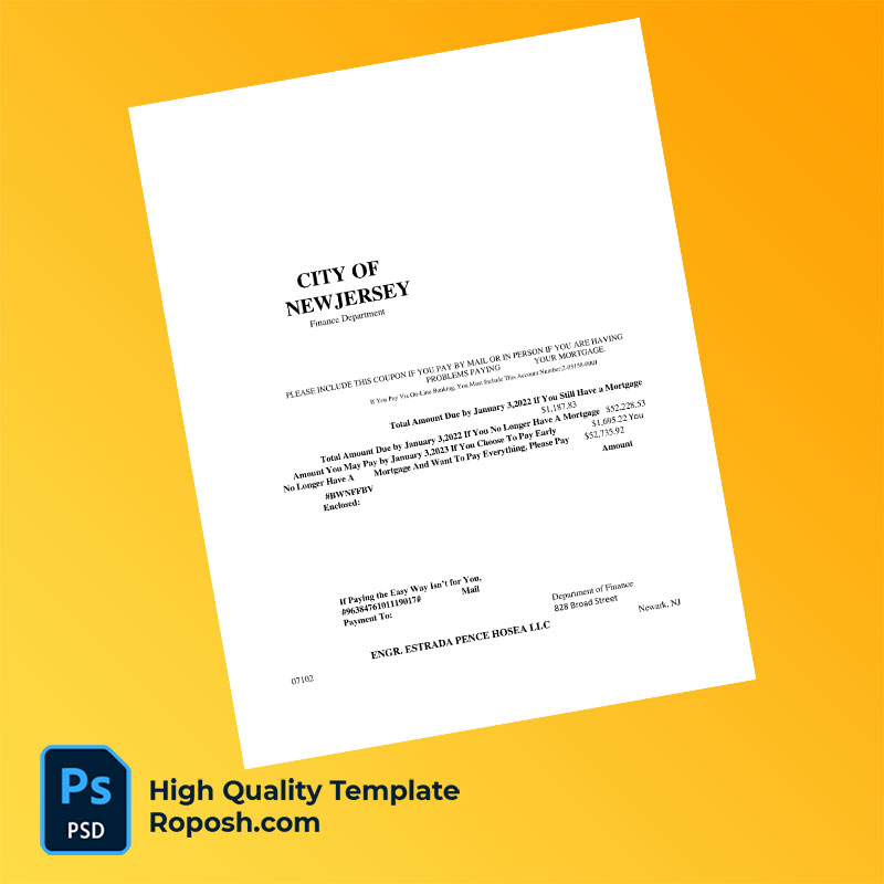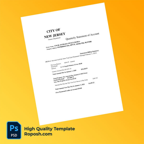 US Jersey City Editable Property Tax Bill Template in Word and PDF formats