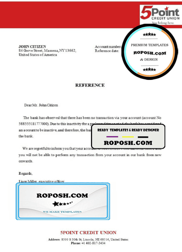 USA 5Point bank account closure reference letter template in Word and PDF format
