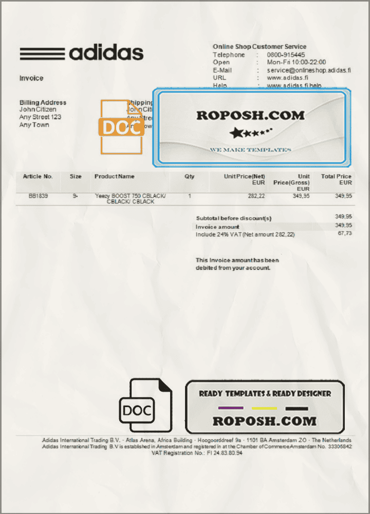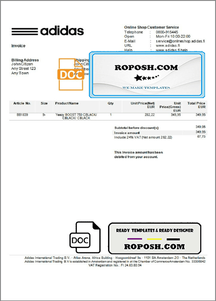 Featuring a wide range of templates from all over the world, the USA Adidas invoice Word Template is fully customizable, and included fonts. Edit all relevant details, such as name, photo, signature, barcodes, and holograms, to create a realistic, high-quality editable invoice template.