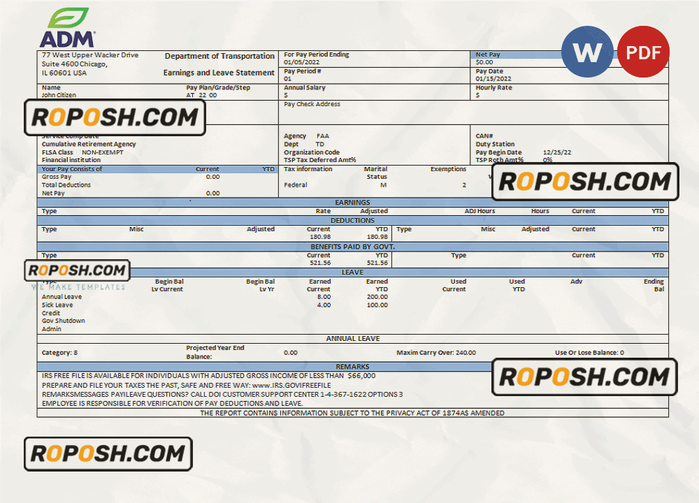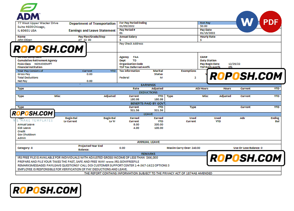 Grab now fully editable USA ADM food processing company pay stub Template from our website roposh and put your own info to create a copy of USA ADM food processing company pay stub template Word and ready your own novelty documents. It’ll be so beneficial if your pay stub is expired, stolen or not available. We also have word invoice template, ID Card psd template, Bank Statement psd template, drivers license psd template, Utility bill psd template & pay stub.