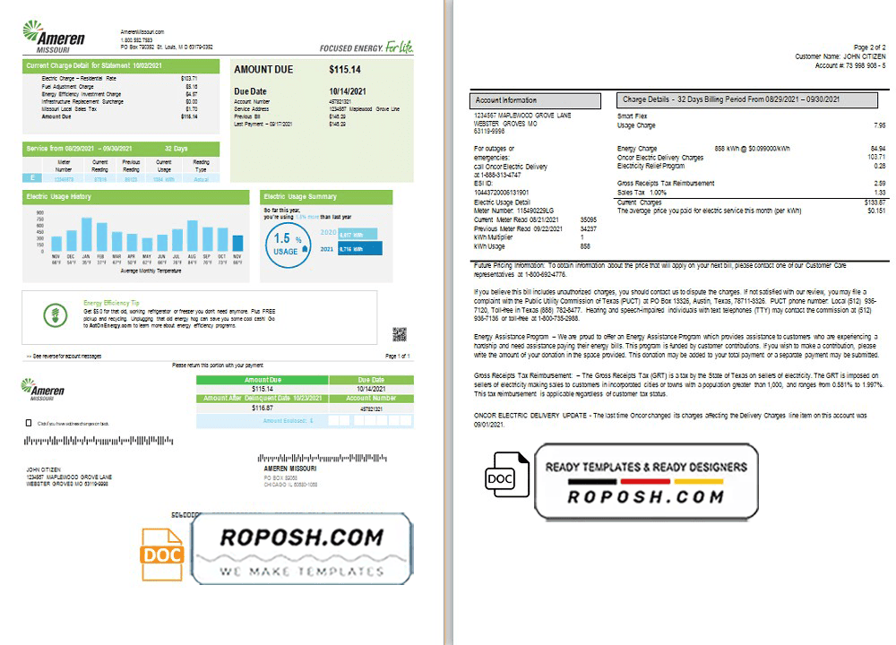 Download our high-quality, fully editable USA Ameren Missouri electricity utility bill template in Word format. This customizable template is layer-based and includes all necessary fonts, making it easy to personalize with any name, address, license number, ID number, birth date, height, weight, expiration date, and more. Perfect for creating a realistic proof of address document.