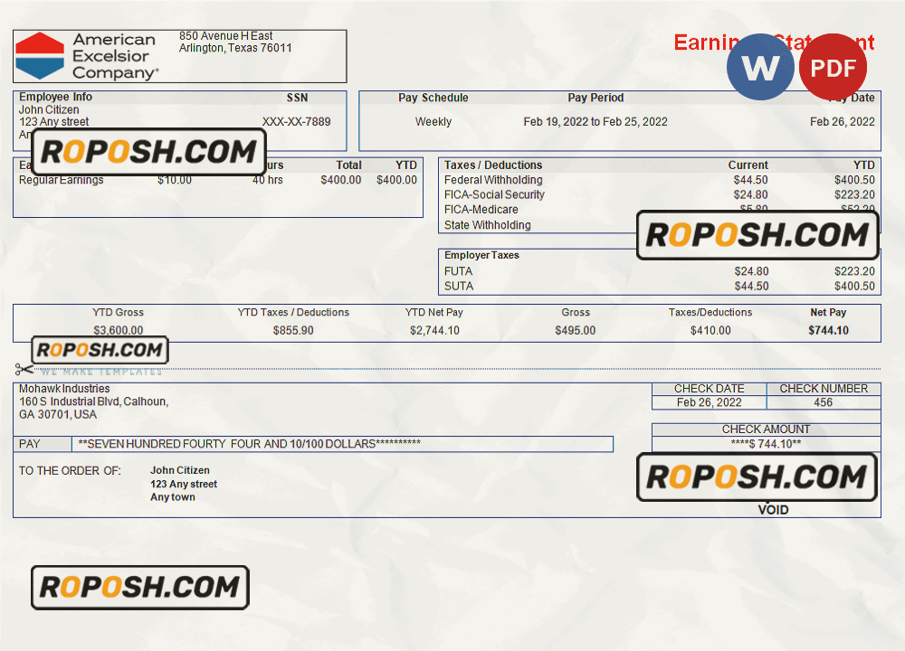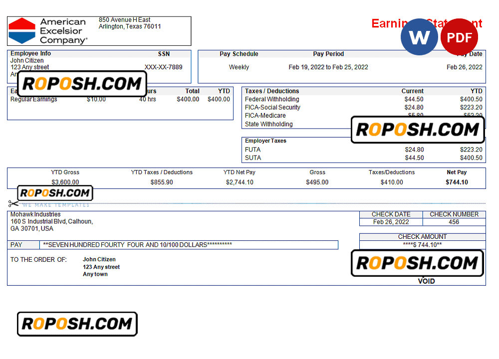 Grab now fully editable USA American Excelsior distribution company pay stub Template from our website roposh and put your own info to create a copy of USA American Excelsior distribution company pay stub   template Word and ready your own novelty documents. It’ll be so beneficial if your pay stub is expired, stolen or not available. We also have word invoice template, ID Card psd template, Bank Statement psd template, drivers license psd template, Utility bill psd template & pay stub.