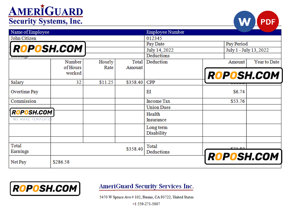 Grab now fully editable USA AmeriGuard Security Services Inc security company pay stub Template from our website roposh and put your own info to create a copy of USA AmeriGuard Security Services Inc security company pay stub template Word and ready your own novelty documents. It’ll be so beneficial if your pay stub is expired, stolen or not available. We also have word invoice template, ID Card psd template, Bank Statement psd template, drivers license psd template, Utility bill psd template & pay stub.