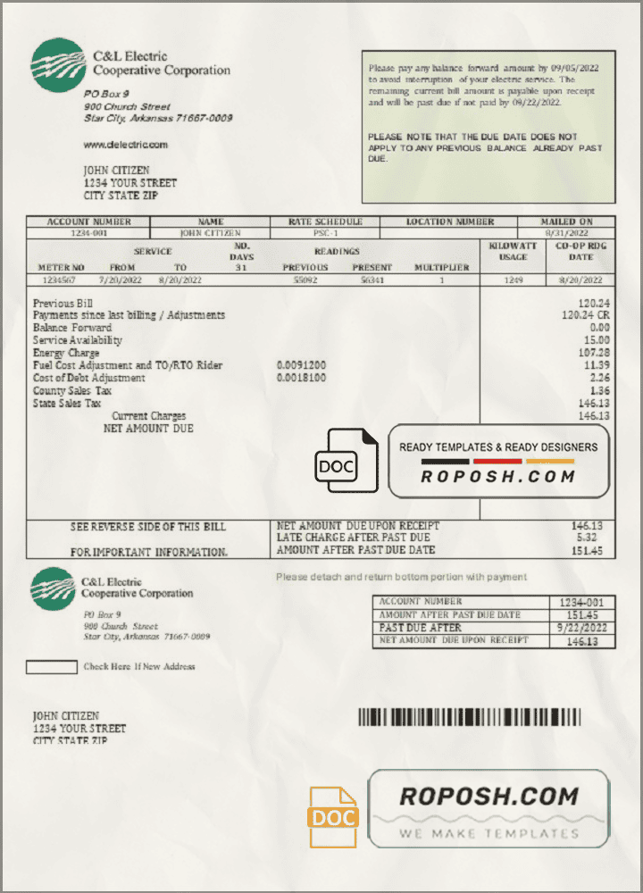 Download our fully editable USA Arkansas C & L Electric Cooperative Corporation utility bill template in Word format. This high-quality, customizable template is layer-based and includes all necessary fonts. Easily modify the template to include any name, address, license number, ID number, birth date, height, weight, expiration date, and more. Perfect for creating a editable utility bill for proof of address. Ensure your documents are up-to-date and avoid account suspensions with our premium template.
