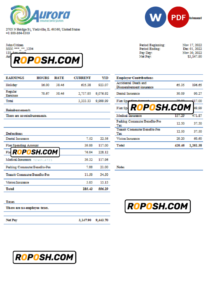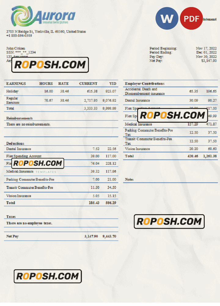 Grab now fully editable USA Aurora Specialty Textiles Group textile company pay stub Template from our website roposh and put your own info to create a copy of USA Aurora Specialty Textiles Group textile company pay stub template Word and ready your own novelty documents. It’ll be so beneficial if your pay stub is expired, stolen or not available. We also have word invoice template, ID Card psd template, Bank Statement psd template, drivers license psd template, Utility bill psd template & pay stub.