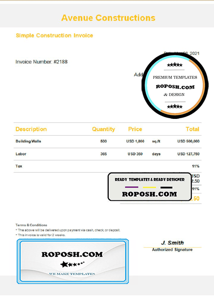 Featuring a wide range of templates from all over the world, the USA Avenue Constructions invoice Word Template is fully customizable, and included fonts. Edit all relevant details, such as name, photo, signature, barcodes, and holograms, to create a realistic, high-quality editable invoice template.