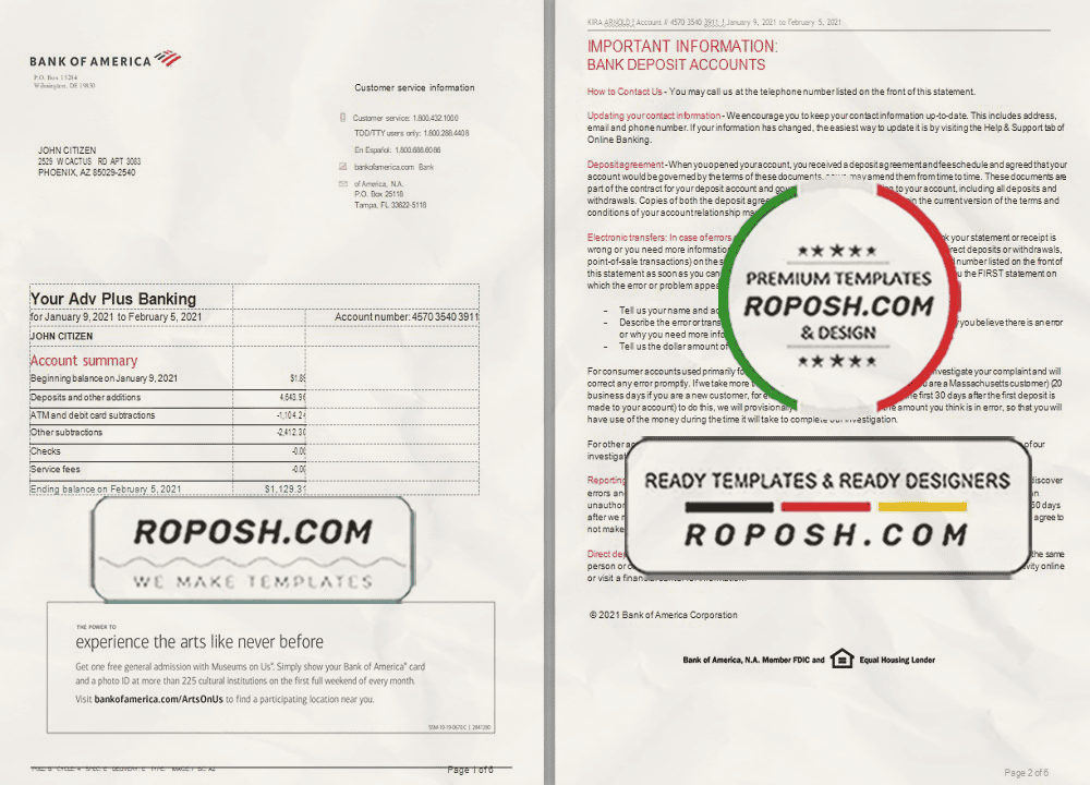 Get your fully editable USA Bank of America Bank Statement Word Template from Roposh and customize it with your own information to create a realistic fake bank statement. This is beneficial if your bank statement is expired, stolen, or unavailable. We also offer editable credit card templates, ID card templates, bank statement PSD templates, driver’s license PSD templates, and printable editable blank utility bill templates.