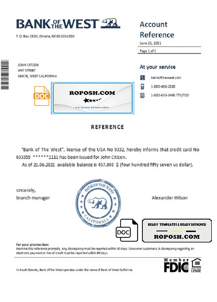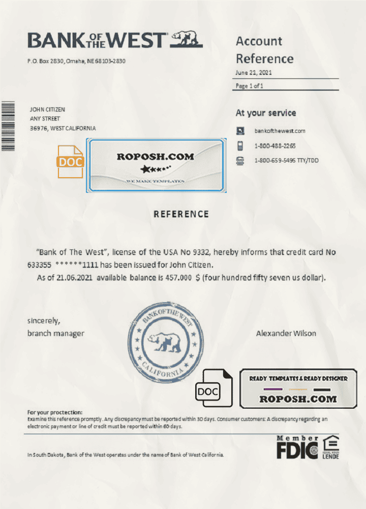 USA Bank of the West bank account reference letter template in Word and PDF format