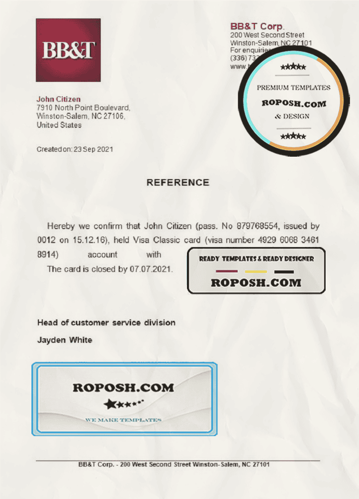 USA BB&T bank account closure reference letter template in Word and PDF format offer high-quality customizable bank reference form template in PSD and Word format, allowing you to easily fill in your personal details and make them look authentic. Our templates are perfect for online account verification, research, presentation, or work.