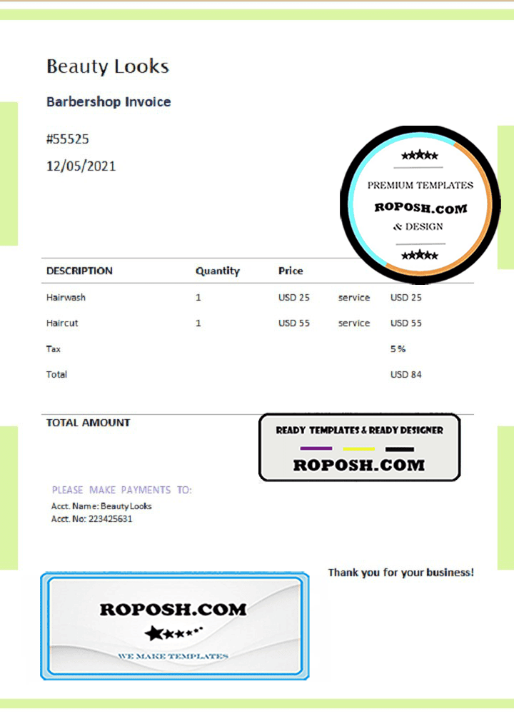 Featuring a wide range of templates from all over the world, the USA Beauty Looks invoice Word Template is fully customizable, and included fonts. Edit all relevant details, such as name, photo, signature, barcodes, and holograms, to create a realistic, high-quality editable invoice template.