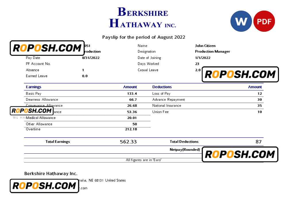 USA Berkshire Hathaway conglomerate company pay stub Word and PDF template