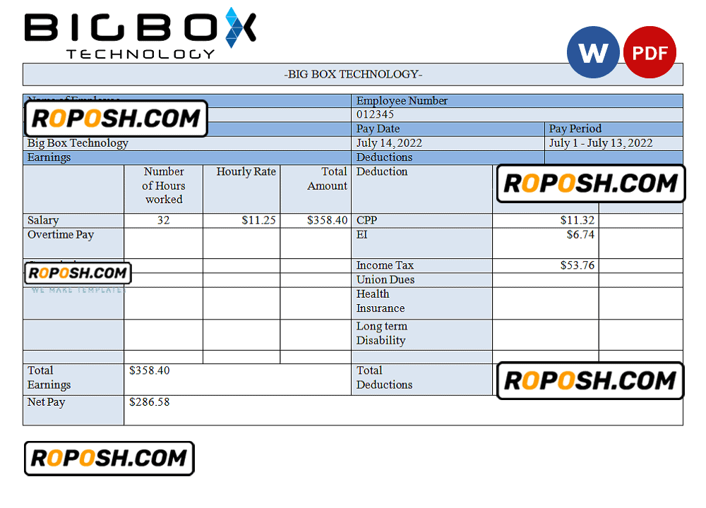 Blank USA Big Box Technologies technology company pay stub Word and Pdf Template use for :
