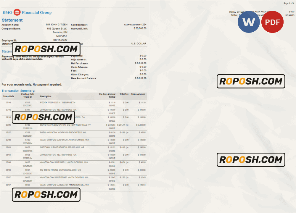 Get your fully editable USA BMO Bank Statement Word Template from Roposh today. Perfect for creating novelty documents if your bank statement is expired, stolen, or unavailable. We also offer editable credit card templates, ID card templates, bank statement PSD templates, driver’s license PSD templates, and printable editable blank utility bill templates.