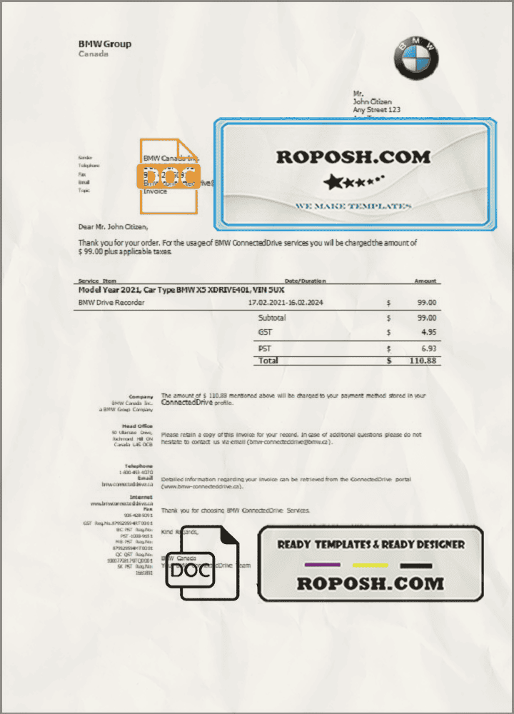 Featuring a wide range of templates from all over the world, the USA BMW invoice Word Template is fully customizable, and included fonts. Edit all relevant details, such as name, photo, signature, barcodes, and holograms, to create a realistic, high-quality editable invoice template.