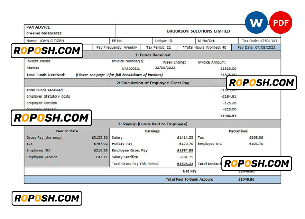 A pay stub form is a template used by an employer to provide detailed information about an employee’s paycheck.It provides information for both the employer and the employee.Fillable USA Brookson solutions limited payslip Word template . Fully editable blank pay stub template. High quality template. Easy to customize, Layer based, fonts included. you can edit this template and put any name, address, license number, Id number, birth date, height, weight, expire date, change photos etc. This Word template is a easy to Editing.To modify this Word template file you will need a Word editing software such as Microsoft Word. Never used low quality template. Your account may be suspended.