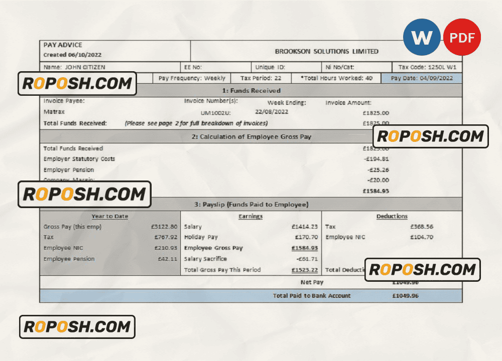 Grab now fully editable USA Brookson solutions limited payslip Template from our website roposh and put your own info to create a copy of USA Brookson solutions limited payslip template Word and ready your own novelty documents. It’ll be so beneficial if your pay stub is expired, stolen or not available. We also have word invoice template, ID Card psd template, Bank Statement psd template, drivers license psd template, Utility bill psd template & pay stub.