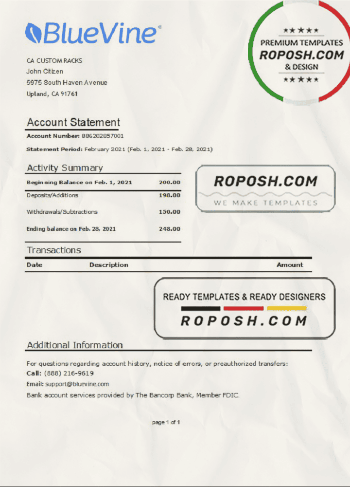 Grab now fully editable USA California BlueVine bank statement easy to fill Excel Template from our website Roposh and put your own info to create Realistic Bank Statement template Excel and ready your own novelty documents. It’ll be so beneficial if your Bank Statement is expired, stolen or not available.We also have editable credit card, ID Card psd template, Bank Statement psd template, drivers license psd template & printable editable blank utility bill template.