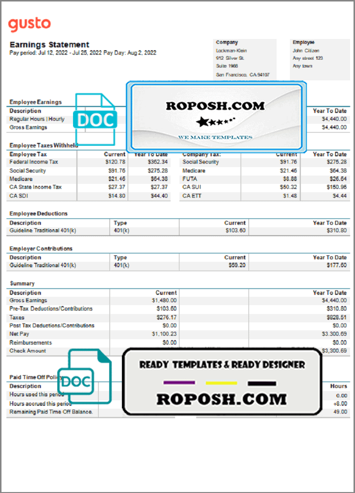 Grab now fully editable USA California business providing company earnings statement Template from our website roposh and put your own info to create a copy of USA California business providing company earnings statement template Word and ready your own novelty documents. It’ll be so beneficial if your pay stub is expired, stolen or not available. We also have word invoice template, ID Card psd template, Bank Statement psd template, drivers license psd template, Utility bill psd template & pay stub.