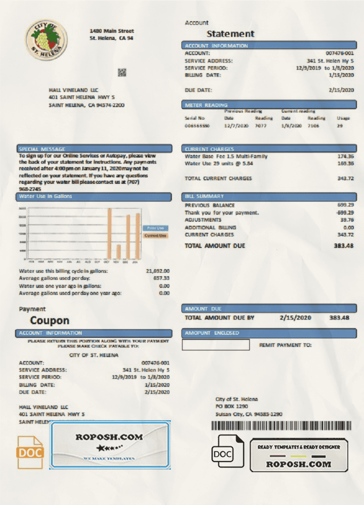 Get your blank USA California City of St Helena utility bill template from Roposh today. Personalize it with your own information to create a convincing proof of address document. This template is especially useful if your original utility bill is expired, lost, or unavailable. We also offer a wide range of other templates, including passport PSD templates, ID card PSD templates, bank statement PSD templates, driver’s license PSD templates, and utility bill PSD templates.