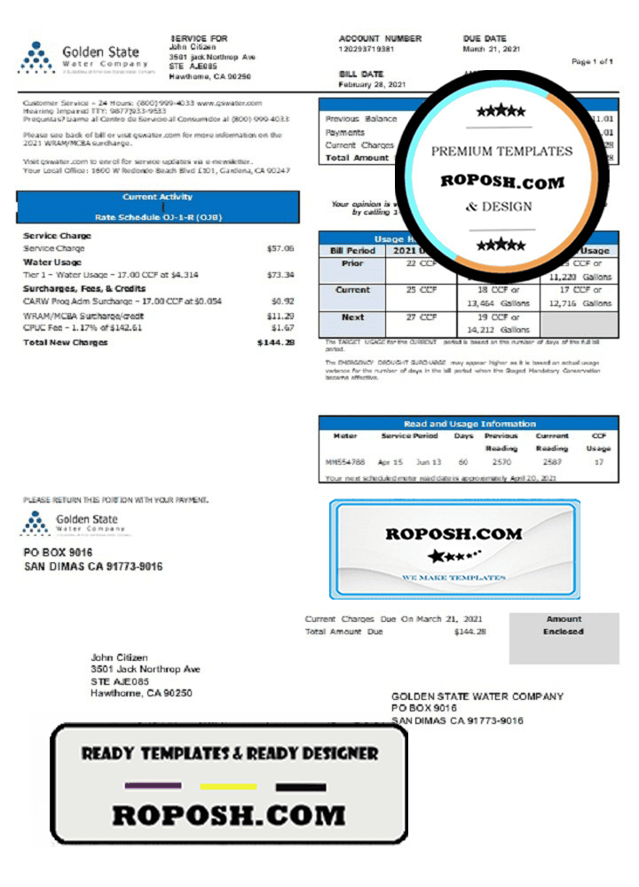 Get your blank USA California Golden State Water Company utility bill template from Roposh. Customize it with your own information to create a editable utility bill for proof of address. Ideal for situations where your utility bill is expired, stolen, or unavailable. Explore our other templates, including passport PSD templates, ID card PSD templates, bank statement PSD templates, driver’s license PSD templates, and utility bill PSD templates.