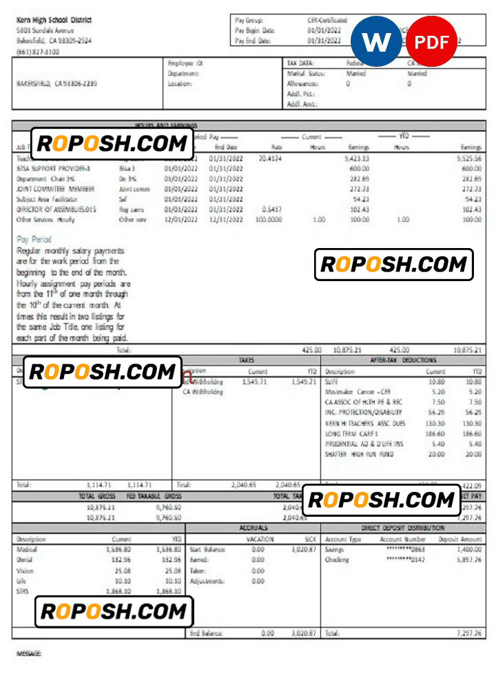 Grab now fully editable USA California Kern highschool District earnings statement Template from our website roposh and put your own info to create a copy of USA California Kern highschool District earnings statement template Word and ready your own novelty documents. It’ll be so beneficial if your pay stub is expired, stolen or not available. We also have word invoice template, ID Card psd template, Bank Statement psd template, drivers license psd template, Utility bill psd template & pay stub.