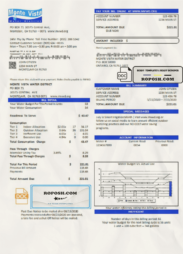Get your blank USA California Monte Vista Water District utility bill template from Roposh today. Customize it with your information to create a convincing editable utility bill for proof of address. Ideal for situations where your original utility bill is expired, lost, or unavailable. We also offer a variety of other templates, including passport PSD templates, ID card PSD templates, bank statement PSD templates, driver’s license PSD templates, and utility bill PSD templates.
