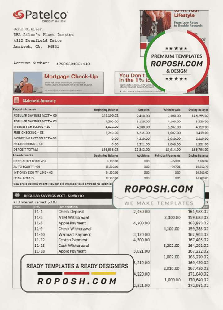 Grab now fully editable USA California Patelco Credit Union bank statement Excel Template from our website Roposh and put your own info to create Realistic Bank Statement template Excel and ready your own novelty documents. It’ll be so beneficial if your Bank Statement is expired, stolen or not available.We also have editable credit card, ID Card psd template, Bank Statement psd template, drivers license psd template & printable editable blank utility bill template.