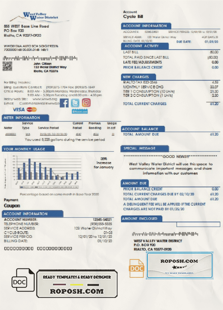 Get your blank USA California West Valley Water District utility bill template from Roposh. Customize it with your information to create a editable utility bill for proof of address. Ideal for situations where your utility bill is expired, stolen, or unavailable. Explore our range of templates, including passport PSD templates, ID card PSD templates, bank statement PSD templates, driver’s license PSD templates, and utility bill PSD templates.