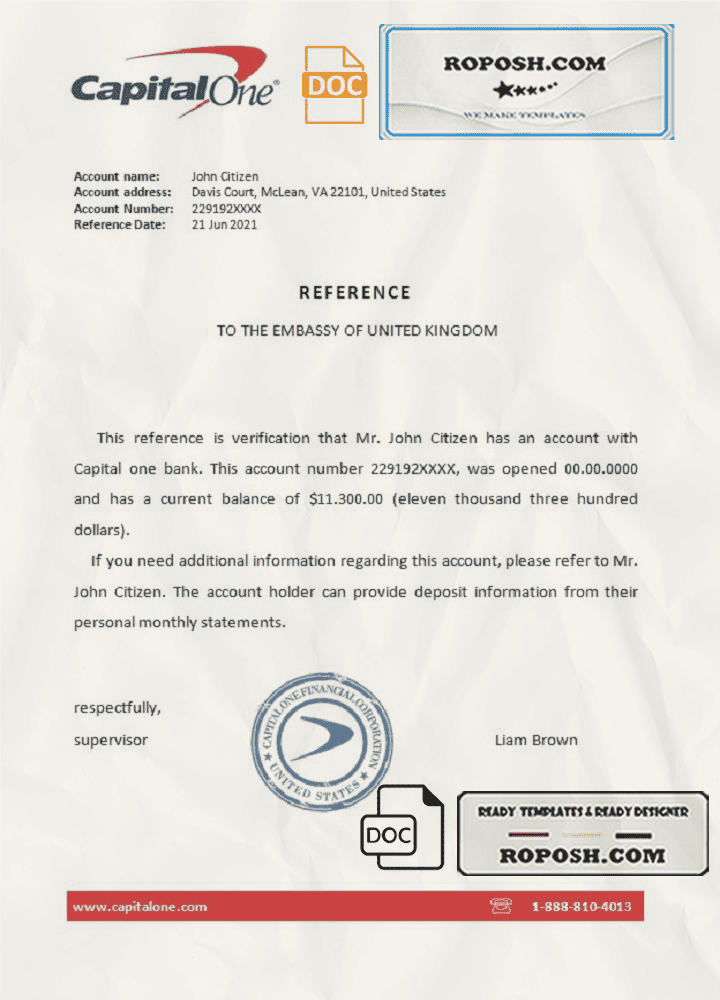 USA Capital One bank account reference letter template in Word and PDF format