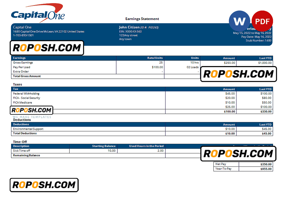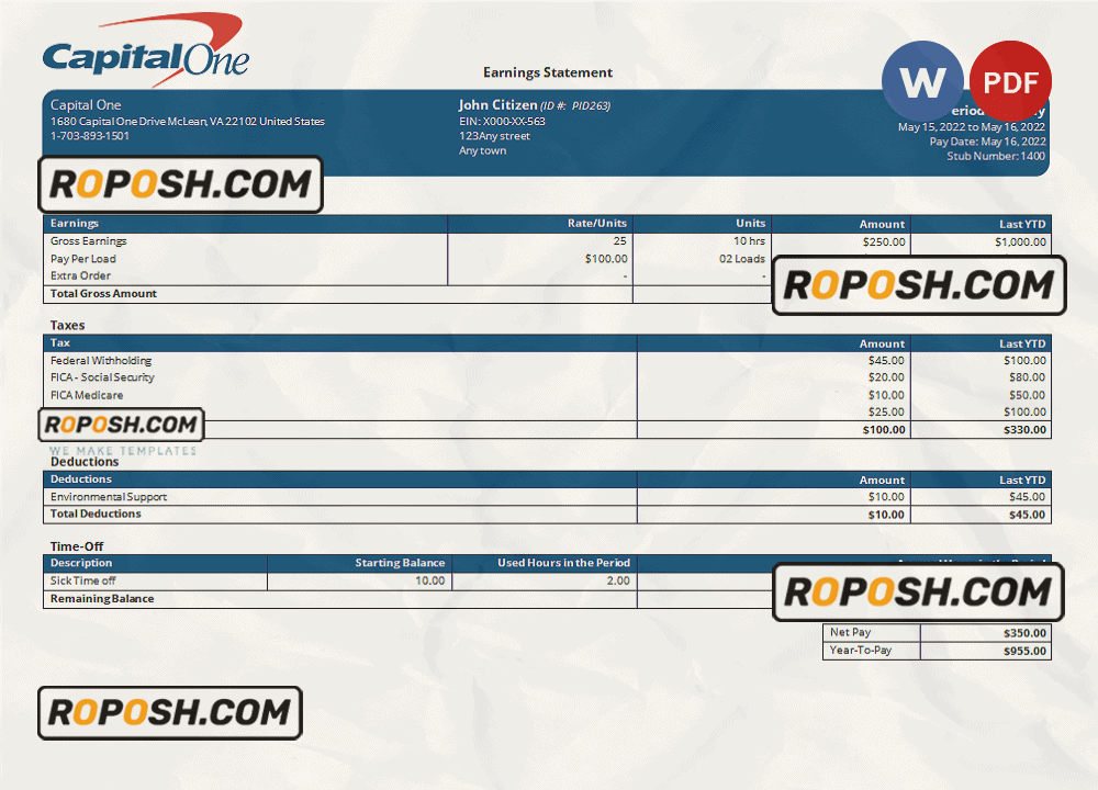 Grab now fully editable USA Capital One banking company pay stub Template from our website roposh and put your own info to create a copy of USA Capital One banking company pay stub template Word and ready your own novelty documents. It’ll be so beneficial if your pay stub is expired, stolen or not available. We also have word invoice template, ID Card psd template, Bank Statement psd template, drivers license psd template, Utility bill psd template & pay stub.