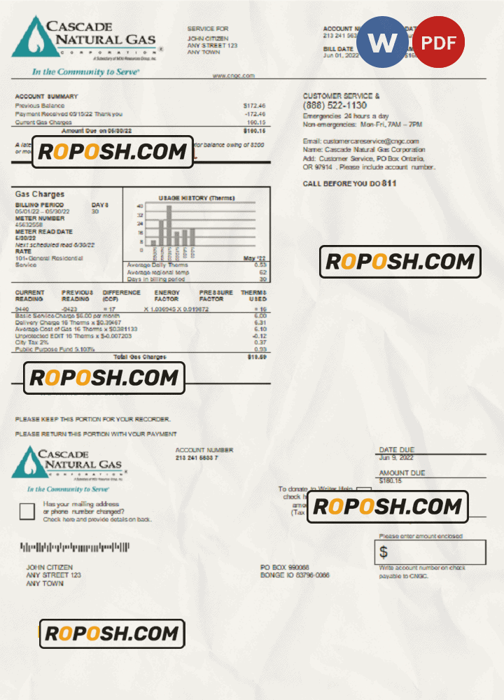 Get your hands on a blank USA Cascade Natural Gas utility bill template from our website, Roposh. Customize it with your own information to create a convincing editable utility bill for proof of address. Ideal for situations where your utility bill is expired, stolen, or unavailable. We also offer a variety of other templates, including passport PSD templates, ID card PSD templates, bank statement PSD templates, driver’s license PSD templates, and utility bill PSD templates.