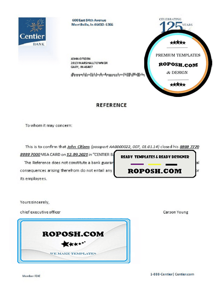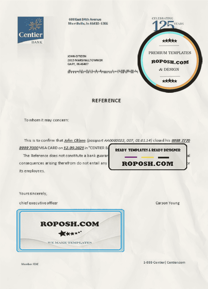 USA Centier Bank bank account closure reference letter template in Word and PDF format offer high-quality customizable bank reference form template in PSD and Word format, allowing you to easily fill in your personal details and make them look authentic. Our templates are perfect for online account verification, research, presentation, or work.