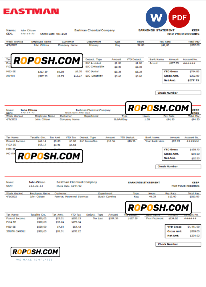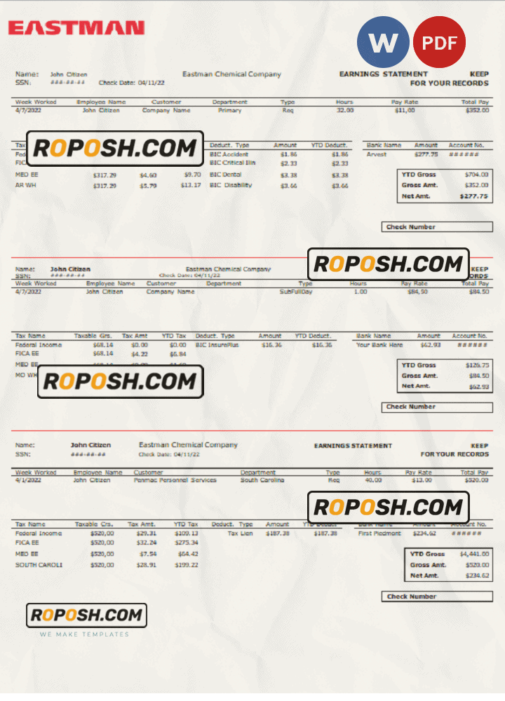 Grab now fully editable USA chemical industry earning statement Template from our website roposh and put your own info to create a copy of USA chemical industry earning statement template Word and ready your own novelty documents. It’ll be so beneficial if your pay stub is expired, stolen or not available. We also have word invoice template, ID Card psd template, Bank Statement psd template, drivers license psd template, Utility bill psd template & pay stub.