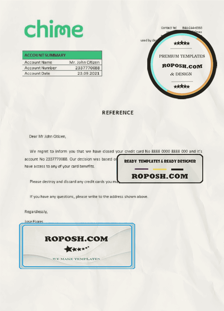 USA Chime bank account closure reference letter template in Word and PDF format offer high-quality customizable bank reference form template in PSD and Word format, allowing you to easily fill in your personal details and make them look authentic. Our templates are perfect for online account verification, research, presentation, or work.