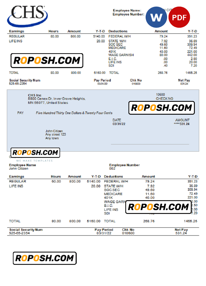 A pay stub form is a template used by an employer to provide detailed information about an employee’s paycheck.It provides information for both the employer and the employee.Fillable USA CHS Inc. agricultural company pay stub Word template . Fully editable blank pay stub template. High quality template. Easy to customize, Layer based, fonts included. you can edit this template and put any name, address, license number, Id number, birth date, height, weight, expire date, change photos etc. This Word template is a easy to Editing.To modify this Word template file you will need a Word editing software such as Microsoft Word. Never used low quality template. Your account may be suspended.