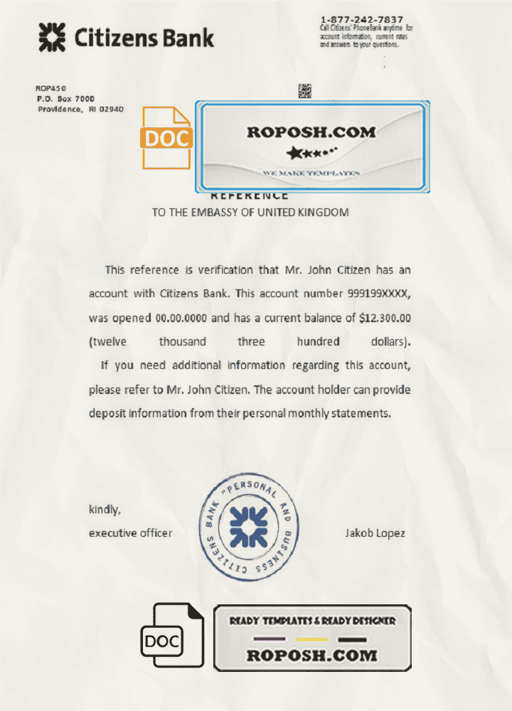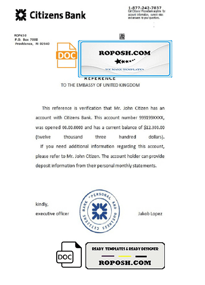 USA Citizens Bank bank account reference letter template in Word and PDF format