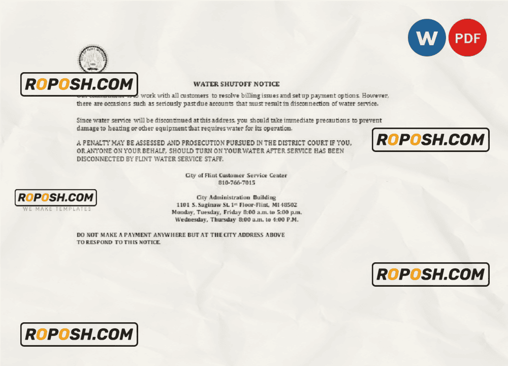 USA City of Flint Michigan Water Utility Bill Template – Editable Word Format
