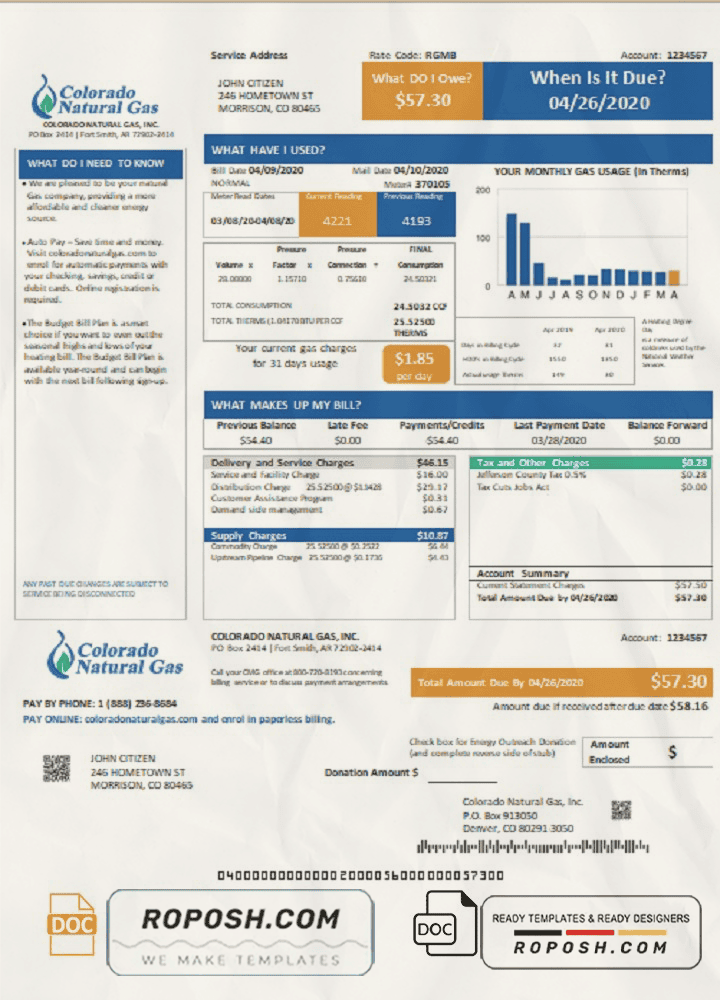 USA Colorado Natural Gas Utility Bill Template – Editable Word Format