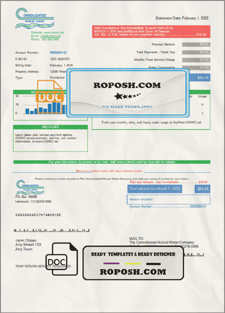 Get your hands on a blank USA Consolidated Mutual Water utility bill template from Roposh. Customize it with your own information to create a realistic proof of address document. Ideal for situations where your utility bill is expired, lost, or unavailable. We also offer a variety of other templates, including passport PSD templates, ID card PSD templates, bank statement PSD templates, driver’s license PSD templates, and utility bill PSD templates.