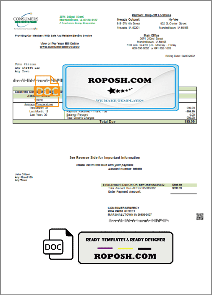 Download our high-quality, fully editable USA Consumers Energy utility bill Word template. This customizable template is layer-based and includes all necessary fonts. Easily modify the template to include any name, address, license number, ID number, birth date, height, weight, expiration date, and more. Perfect for creating a editable utility bill for proof of address. Ensure your documents are up-to-date and avoid account suspensions with our premium template.
