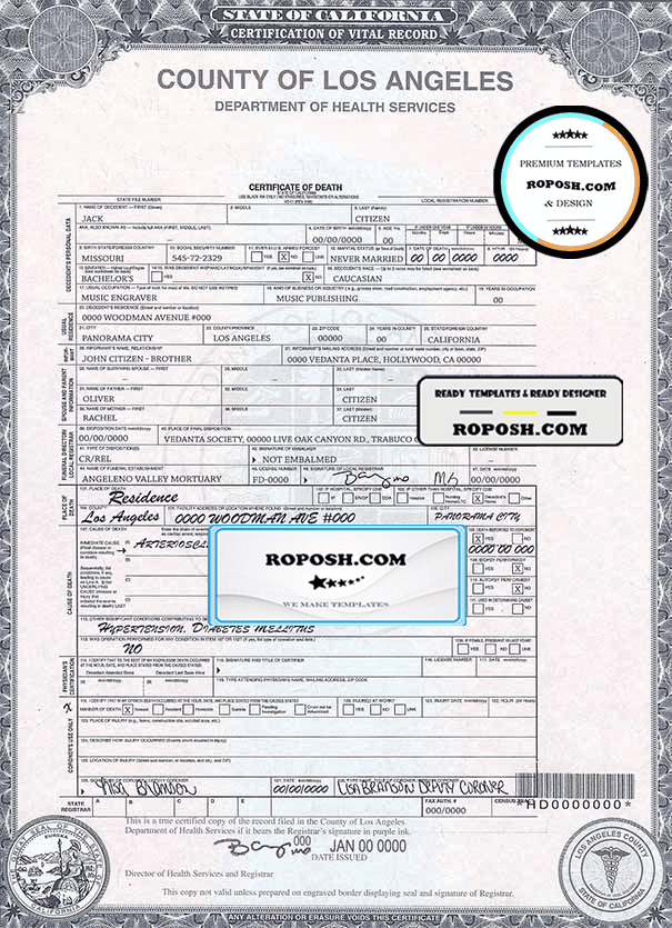 Authentic Editable USA county of Los Angeles Death Certificate Template :