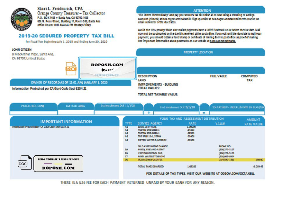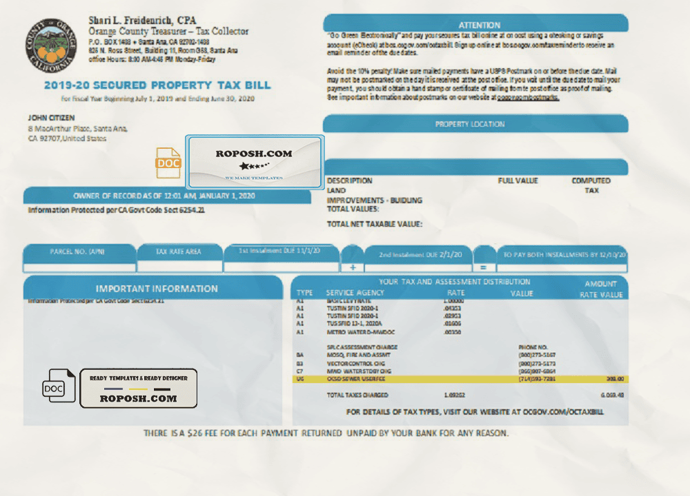 Get your blank USA County of Orange California property tax utility bill template from Roposh. Customize it with your information to create a editable utility bill for proof of address. Ideal for situations where your utility bill is expired, stolen, or unavailable. We also offer a variety of other templates, including passport PSD templates, ID card PSD templates, bank statement PSD templates, driver’s license PSD templates, and utility bill PSD templates.