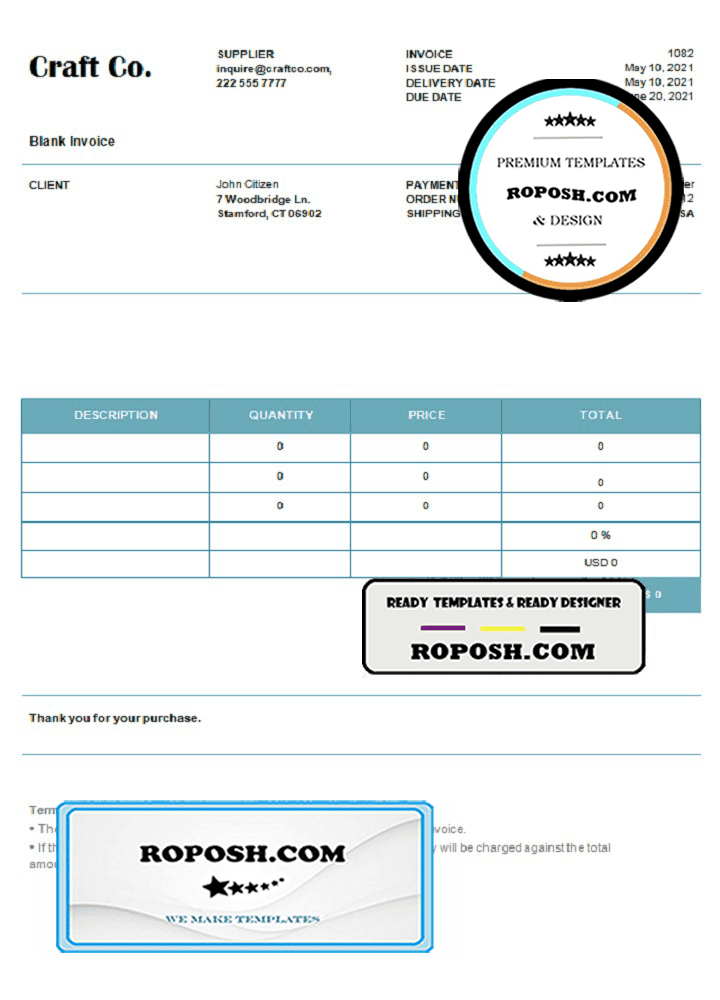 Featuring a wide range of templates from all over the world, the USA Craft Co. invoice Word Template is fully customizable, and included fonts. Edit all relevant details, such as name, photo, signature, barcodes, and holograms, to create a realistic, high-quality editable invoice template.