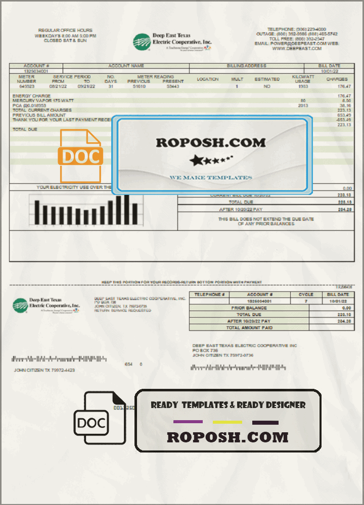 Download our high-quality, fully editable USA Deep East Texas Electric utility bill template in Word format. This customizable template is layer-based and includes all necessary fonts. Easily modify the template to include any name, address, license number, ID number, birth date, height, weight, expiration date, and more. Perfect for creating a realistic proof of address document.