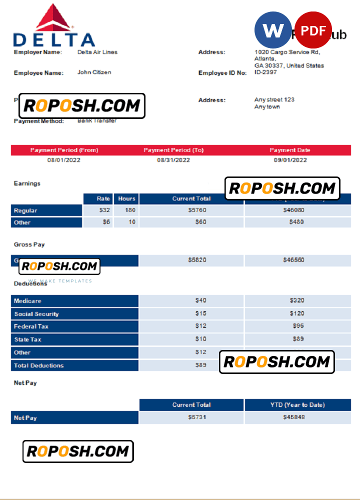USA Delta Air Lines airlines company pay stub Word and PDF template