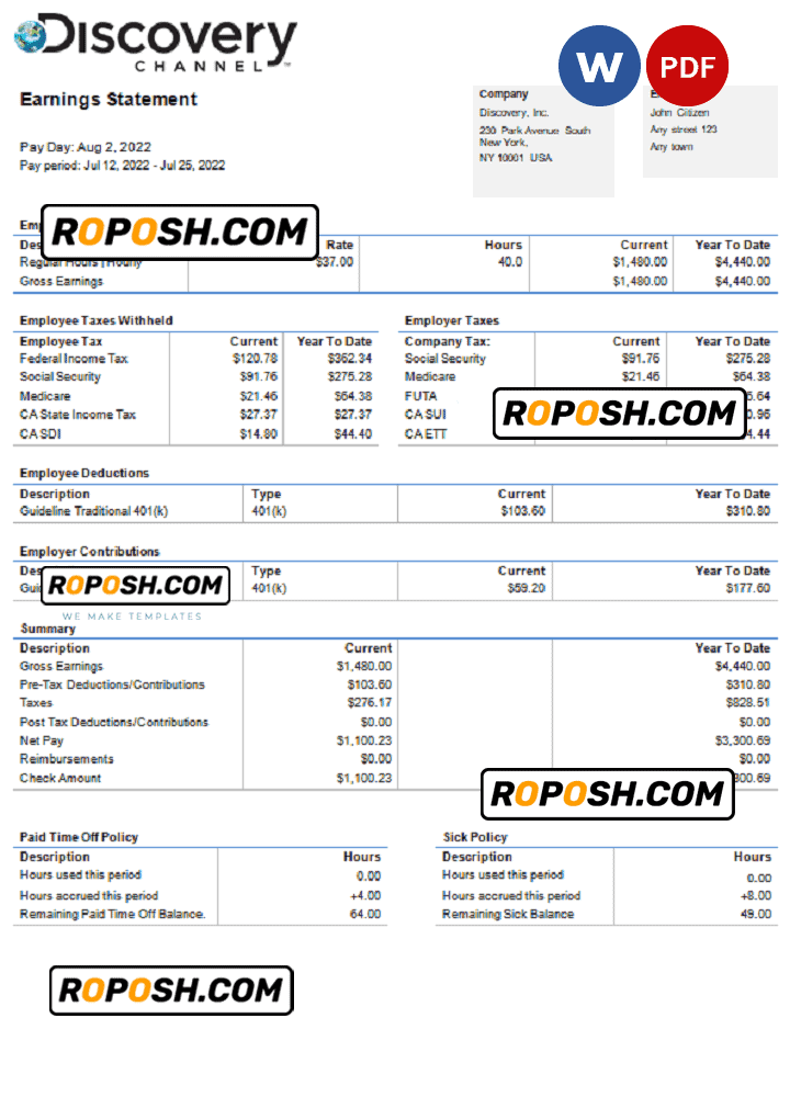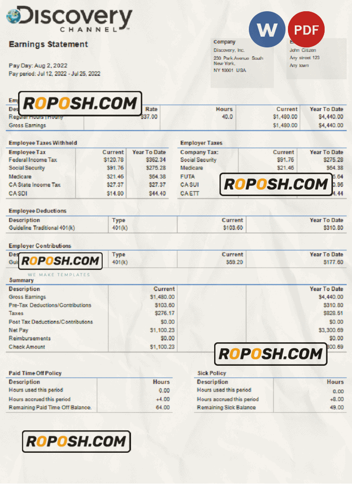 A pay stub form is a template used by an employer to provide detailed information about an employee’s paycheck.It provides information for both the employer and the employee.Fillable USA Discovery Inc. entertainment company pay stub Word template . Fully editable blank pay stub template. High quality template. Easy to customize, Layer based, fonts included. you can edit this template and put any name, address, license number, Id number, birth date, height, weight, expire date, change photos etc. This Word template is a easy to Editing.To modify this Word template file you will need a Word editing software such as Microsoft Word. Never used low quality template. Your account may be suspended.