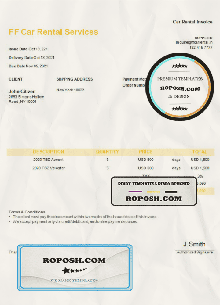 Featuring a wide range of templates from all over the world, the USA FF Car Rental Services invoice Word Template is fully customizable, and included fonts. Edit all relevant details, such as name, photo, signature, barcodes, and holograms, to create a realistic, high-quality editable invoice template.
