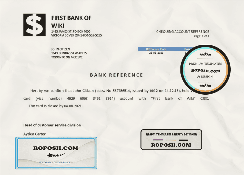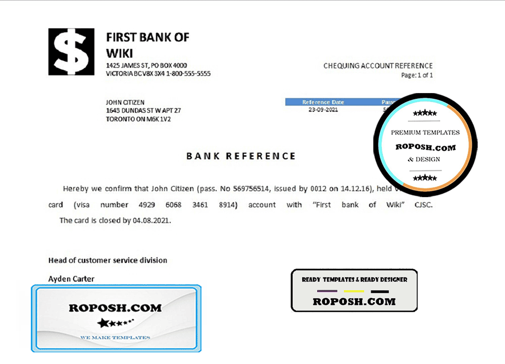 USA First Bank of Wiki bank account closure reference letter template in Word and PDF format offer high-quality customizable bank reference form template in PSD and Word format, allowing you to easily fill in your personal details and make them look authentic. Our templates are perfect for online account verification, research, presentation, or work.