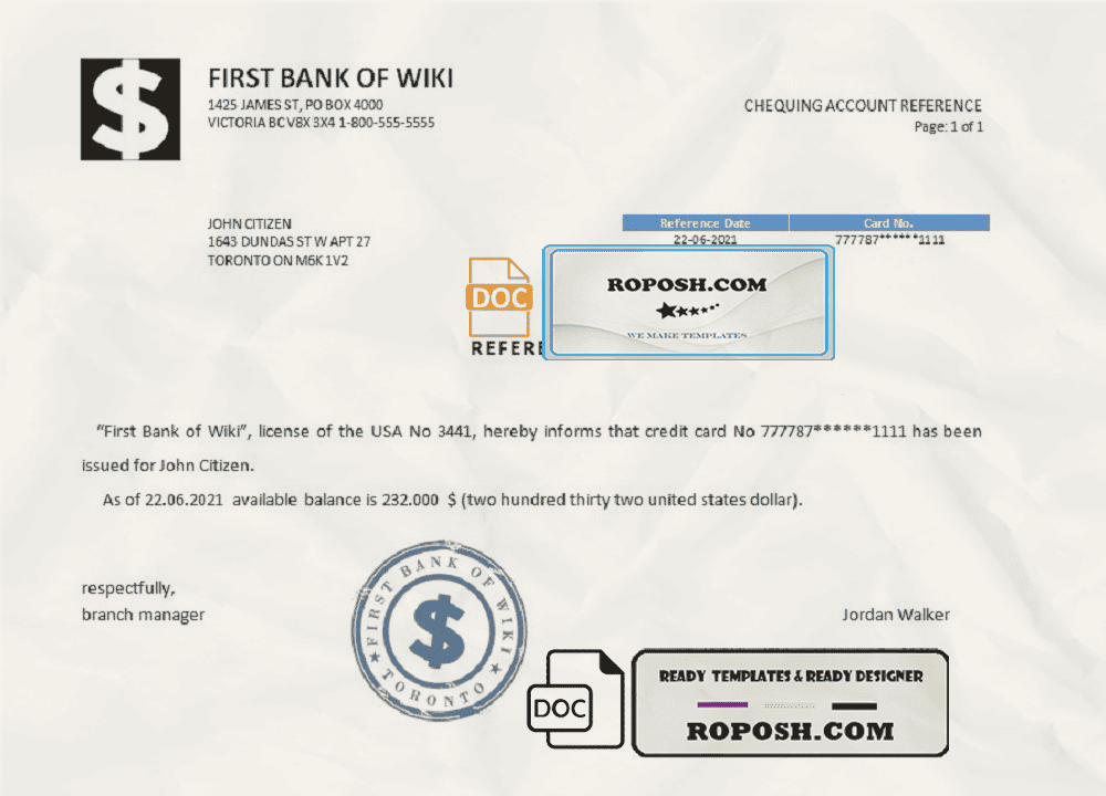 USA First Bank of Wiki bank account reference letter template in Word and PDF format