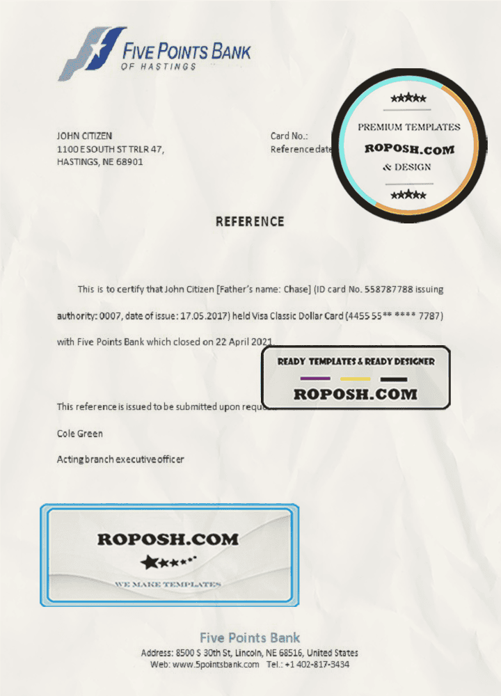 USA Five Points Bank bank account closure reference letter template in Word and PDF format offer high-quality customizable bank reference form template in PSD and Word format, allowing you to easily fill in your personal details and make them look authentic. Our templates are perfect for online account verification, research, presentation, or work.